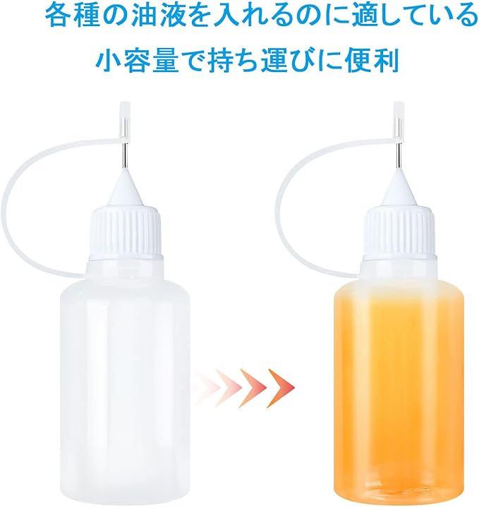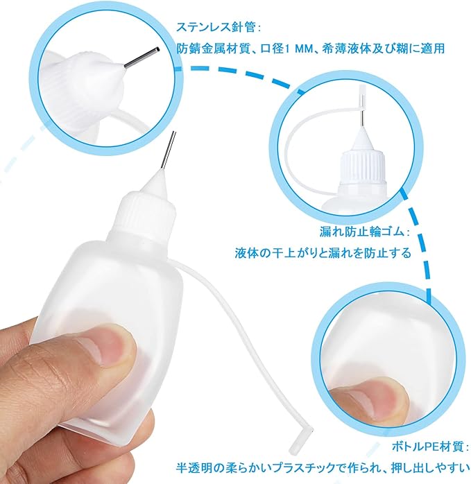 ステンレス製ボトル先端:この製品のボトル先端はステンレス製ので細かい作業にも最適です。例えば、塗料、工作用の糊、オイル、エッセンス、点眼液、食塩液など。
