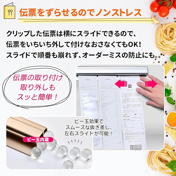 【伝票をずらせるのでノンストレス】クリップした伝票は横にスライドできるので、伝票をいちいち外して付けなおすなんて事はしなくてもOK。伝票をスライドで順番も崩れず、オーダーミスの防止にも。もちろん伝票の取り付け・取り外しもスッと簡単に行えます。