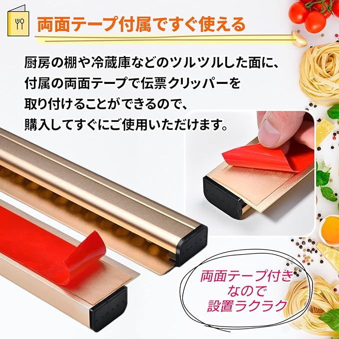 【両面テープ付属ですぐ使える】両面テープが付属します。厨房の棚や冷蔵庫などのツルツルした面に、付属の両面テープで伝票クリッパーを取り付けることができるので、購入してすぐにご使用いただけます。