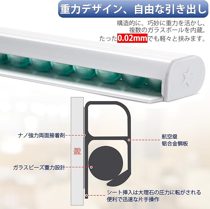 【自由に引き抜き】構造上、我々は巧妙に重力を活かし、複数のガラスボールを内蔵。弾珠の間に紙を挟むだけで、弾珠は落ちず、スムーズに横に滑ります。薄いレシートなどの用紙だけでなく、複数の用紙を折り重ねて一緒に固定することも可能です。