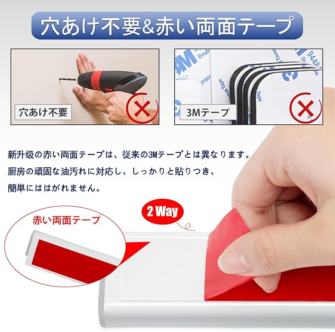 【穴あけ不要】あらかじめ両面テープが付着されており、フィルムを剥がしてそのまま簡単設置できます。溶接レベルの粘着性を備えています。この裏面粘着剤は防水性、耐温性、無臭性、耐腐食性、強い粘着性、大きな強度などの利点があります。さらに、あらゆる素材から剥がしても痕跡が残りません。