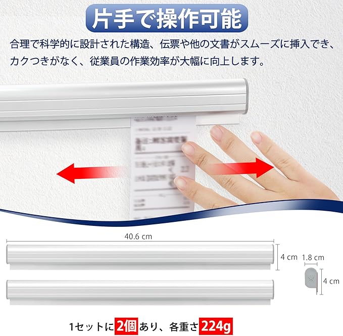 【簡単に注文書を挟む】 オーダークリッパー(伝票ホルダー)本体:約40㎝ 約4㎝ 1.8㎝ 2個セット、重量:約224g/個。これは壁掛けの注文書クリップです。非常にスマートで、余分なスペースを取りません。注文書を整理するのに非常に便利です。クリップの角は丸みを帯びており、意外なケガを防ぎます。