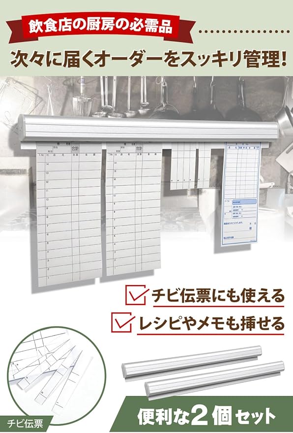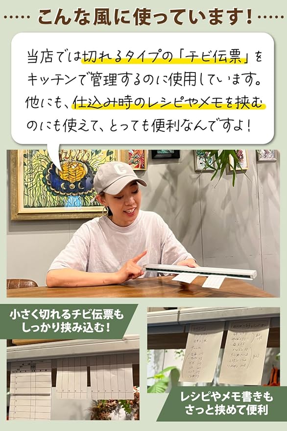 飲食店で伝票やオーダーチップを挿したり、仕込み時にレシピやメモを挿す用途で設計されております。
