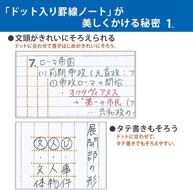 ・罫線上に等間隔に並んだドットを活用することでノートを美しく書くことができ、書いた後見返しやすく、効率的に学習することができます。