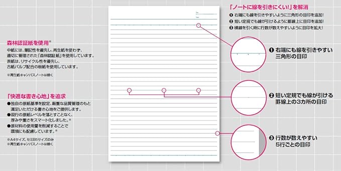 タテ線が正確に引けるよう、センターと両端に三角形のメモリ点を配置しました。また、短い定規でも線を引けるよう罫線の中央部分にも目印を設けました。