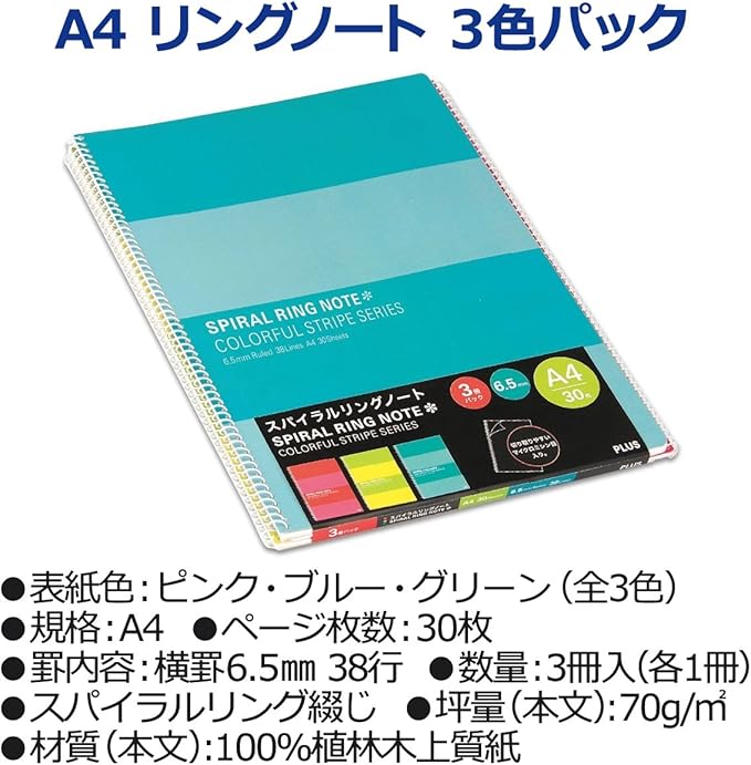 プラス リングノート A4 6.5mm横罫 30枚 3冊入 RS-230-3P 3色色込 76802