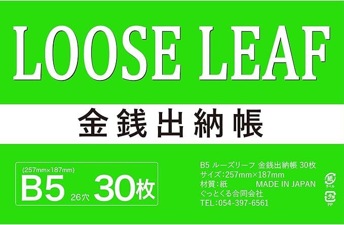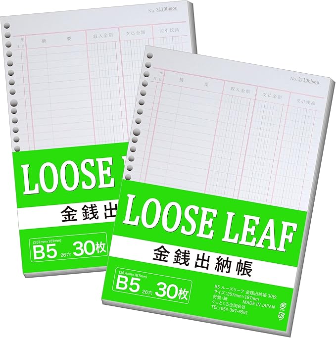 [日本製] ルーズリーフ 金銭出納帳 B5 26穴 30枚 増量タイプ (まとめ買い2パック)