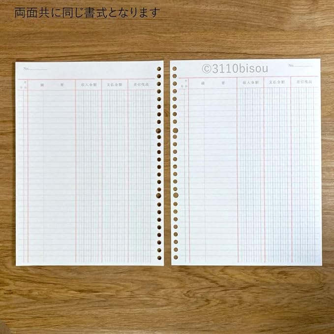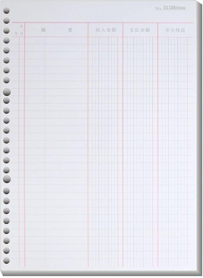 とってもシンプルな金銭出納帳です。 穴が開いてるのでファイルに収納しやすいです! B5サイズのルーズリーフバインダー(26穴または2穴)に収納が出来ます。日付・勘定科目・摘要 ・収入金額 ・支払金額 ・差引残高が書き込みやすいように作られています。サイズ:B5(25.7cm 18.7cm) 1パック30枚入り