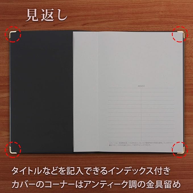 ・金の箔押し、アンティーク調の金具をコーナーに留めて、落ち着いた雰囲気に