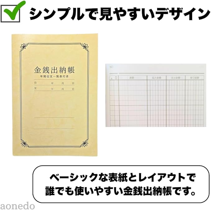 【シンプルで見やすいデザイン】ベーシックな表紙とレイアウトで、誰でも使いやすい金銭出納帳です。