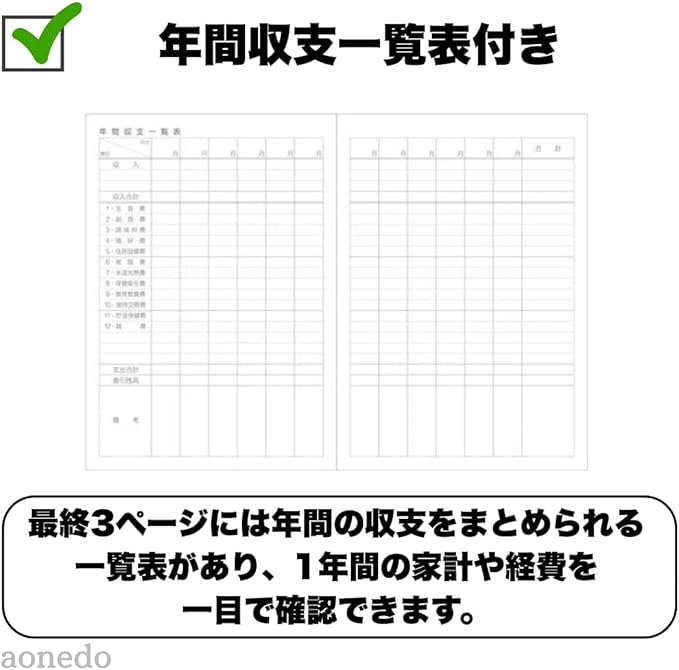 【年間収支一覧表付き】最終3ページには年間の収支をまとめられる一覧表があり、1年間の家計や経費を一目で確認できます。