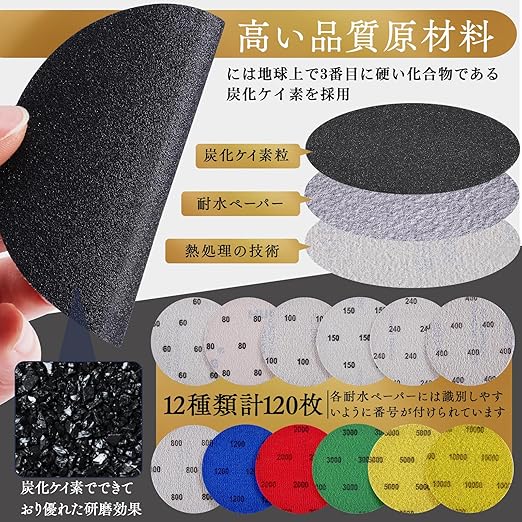【種類が豊富】サイズ:75mmX75mm、粗目から細目まで、120枚に12タイプ(#60#80#100#150#240#400#800#1200#2000#3000#5000#10000各10枚)乾湿両用で使用可能。各サンドペーパーの裏には番号が付いています、小分け袋に入れてお届けしますので、紙ヤスリの番手を間違えることにご心配しないでください。