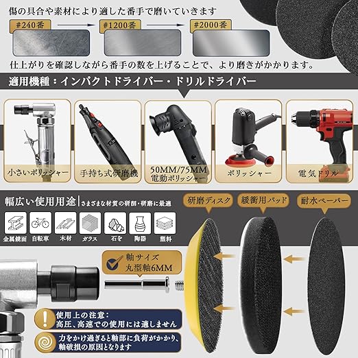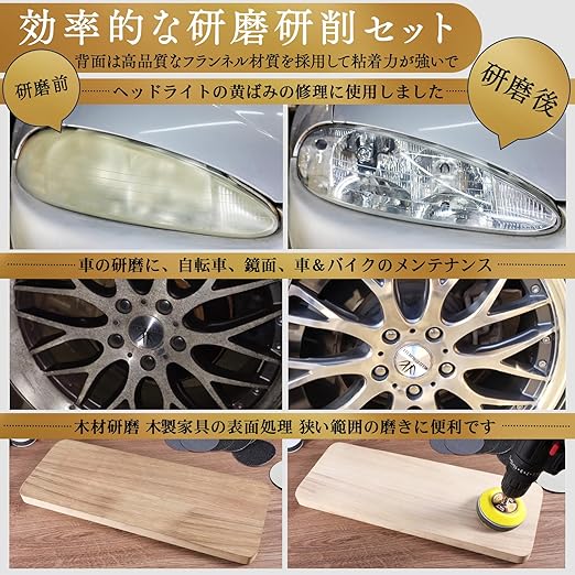 【幅広い使用用途】黄ばんだヘッドライトを修理するために利用しました、ヘッドライト磨きに使用、車のバンパーでパテ研磨、車の研磨に、自転車、鏡面、車&バイクのメンテナンス、木材や金属板で、金属の錆の除去、板金塗装、清掃シンクを磨、陶器、石を 、ガラス、木製家具の表面処理、木工用生地研磨、サビ落としなど、狭い範囲の磨きに便利です、陶器製の洗面台、プラモデルなどに
