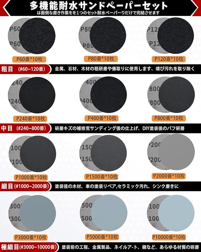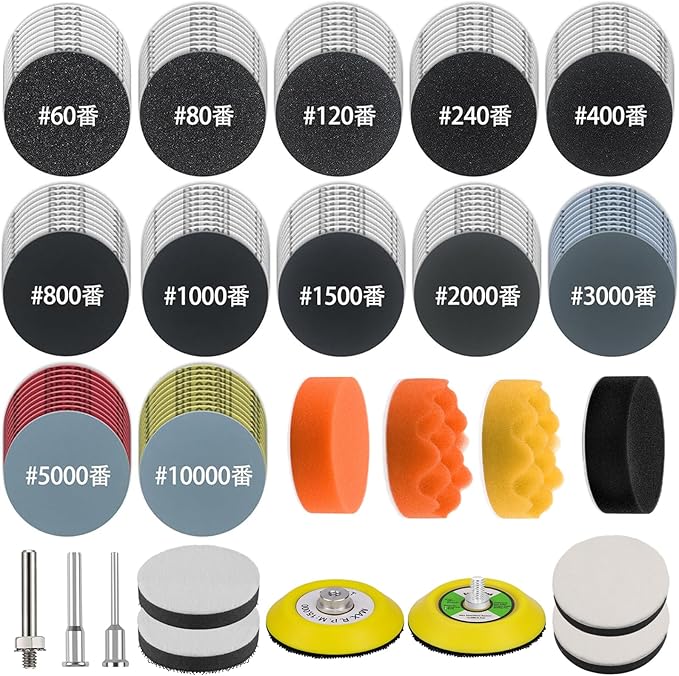 耐水ペーパー セット 75mm ウェット&ドライ両用 サンドペーパー 12種類(#60~10000番) マジック式 ディスクペーパー ポリッシャーバフ スポンジ 粗磨きから鏡面仕上げまで ヘッドライト研磨や車の水垢取り・木材・金属・ガラス・DIYの塗装下地作りに最適、電動ポリッシャー・ドリル兼用(計133枚入)