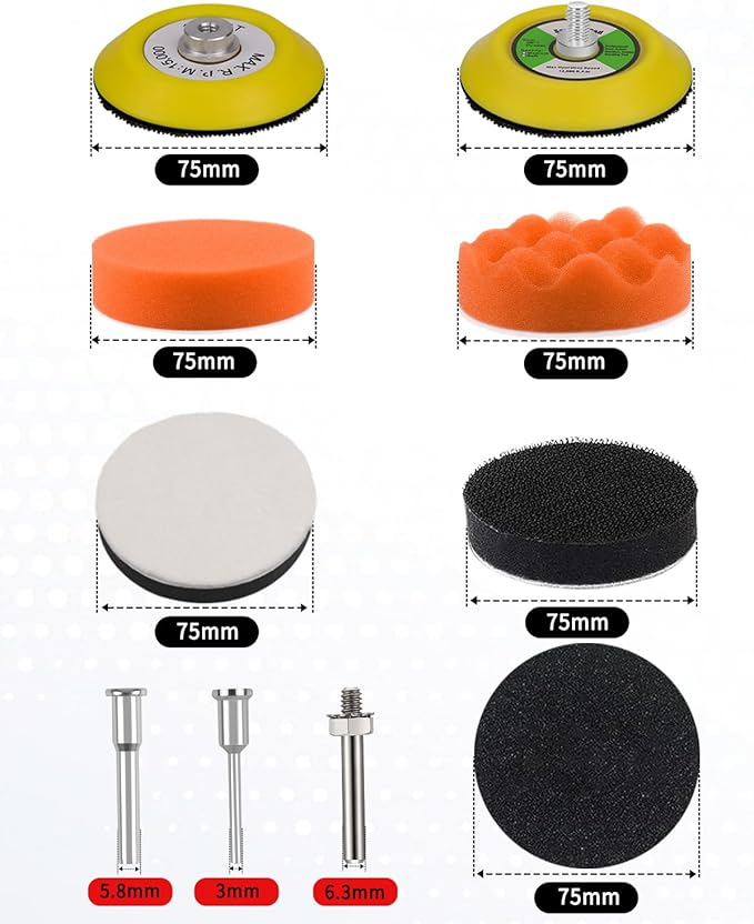 【仕上げバフセット】洗って再利用できる,研磨スポンジは3色の異なる硬度で(オレンジ>黄色>黒)磨く対象に合わせて、スポンジの形状や色をお選びいただけます、スポンジがツヤ出し、傷消しや研磨や光沢仕上げ用です;ウールバフが汚れ取り除き、ワックス拭き取りや研磨に最適です。ほとんどの場所をカバーし、美しい表面を仕上げることができます