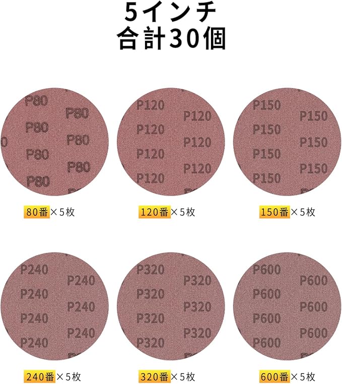 【ユニバーサル仕様】直径125mm(5インチ)のサンディングパッドは、さまざまなタイプのランダムサンダーに適しています,DIYに最適なセットです