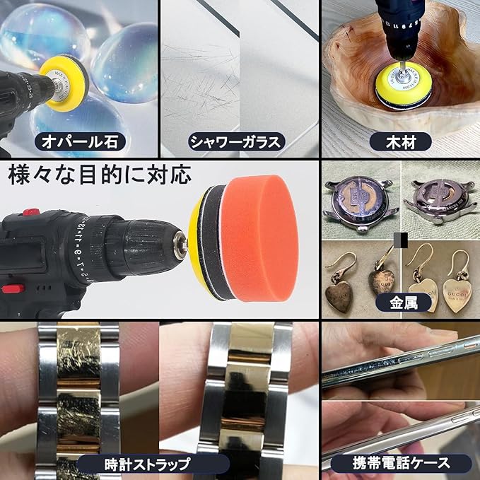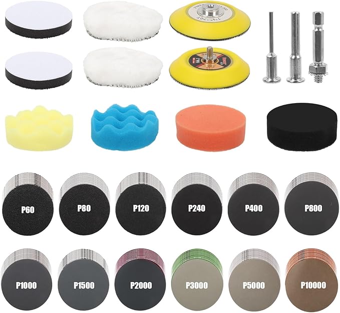 【多機能研磨セット】サンダーペーパーには、60~10000番手までの75mmサンドペーパー120枚(各番手10枚)、6枚の研磨パッド(2枚緩衝プレート付き)、2枚六角軸&1枚丸軸、スポンジサンディングブロック2個が含まれ、研磨~仕上げまでこれ1つで完了。