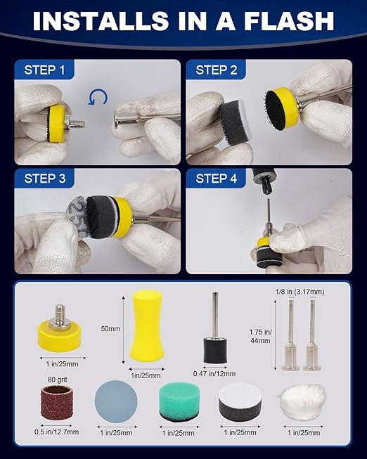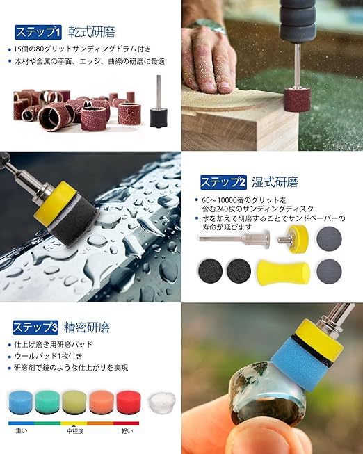 耐水ペーパー セット: 紙やすり セットはアルミ製サンドサークルで乾式研磨を行い、水を使用した湿式研磨で滑らかな仕上がりを実現。仕上げには研磨スポンジとバフ ポリッシャーを使用。3 mmシャンク対応のバックパッドでさまざまなアクセサリーに互換性あり