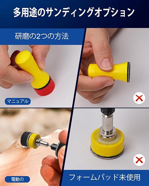 研磨スポンジとバフ付き: スポンジバフは5色の硬さで異なる研磨ニーズに対応。赤とオレンジは軽研磨用、黄色は中研磨用、青と緑は重研磨用。順番に緑、青、黄色、オレンジ、赤を使用し、最後にバフ ポリッシャーでコンパウンド 鏡面仕上げを行い、鏡面のような光沢を実現