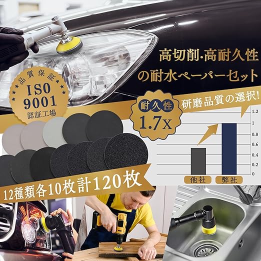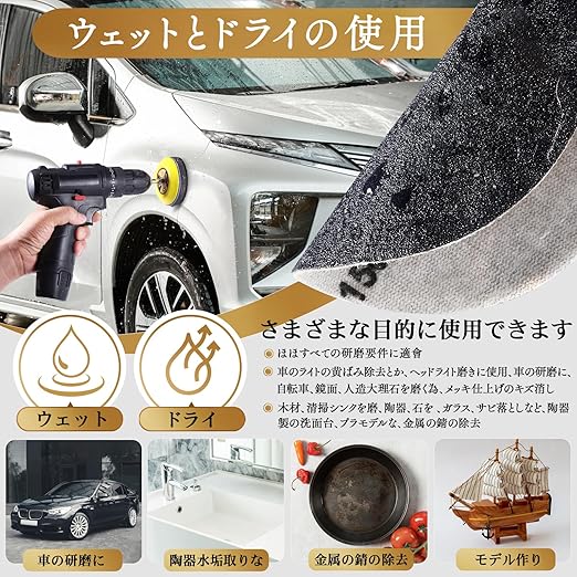 【高品質の素材】高級なラテックス紙を採用し、研磨する時に乾いても濡れても使えますので、工芸美術、木材、塗装表面、ガラス繊維、自転車、バイク、金属、ジュエリー、自動車、鏡面、プラスチック、プラモデルなどに応用することができます。