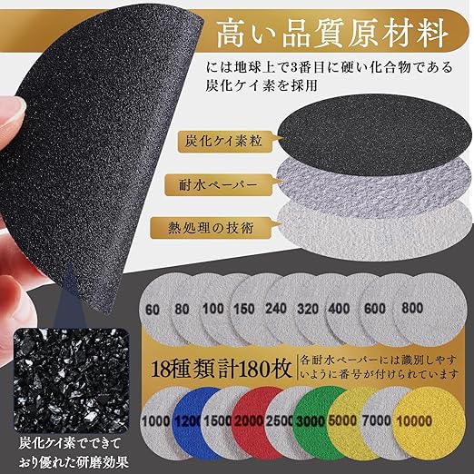 【完備の番手】25mmX25mm;180枚に18タイプ(#60#80#100#150#240#320#400#600#800#1200#1500#2000#2500#3000#5000#7000#10000各10枚)番手ごとに小分け袋に入れてお届けしますので、紙ヤスリの番手を間違えることにご心配しないでください。