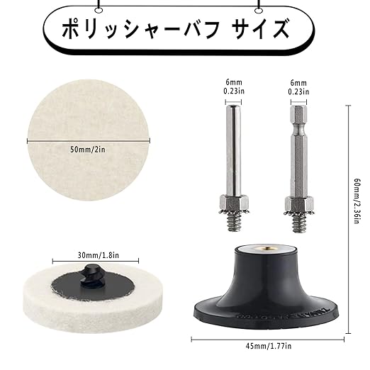 研磨バフサイズ:フェルトバフ 外径50mm、厚さ8mm、ディスクブラケット直径45mm、軸の直径6mm、高さ60mm、電動工具、電動ドリル、エア工具研磨機などに適用、して伝統的な手ヤスリと比べてよりリラックス