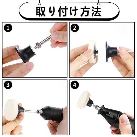ポリッシャーバフセット内容:15枚 フェルト バフ、1個 ディスクブラケット、1個金属六角軸、1個 金属丸シャフト,フェルトバフはユニークな安全トルクネジがあり、ツールで簡単に取り外すことができます,