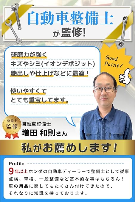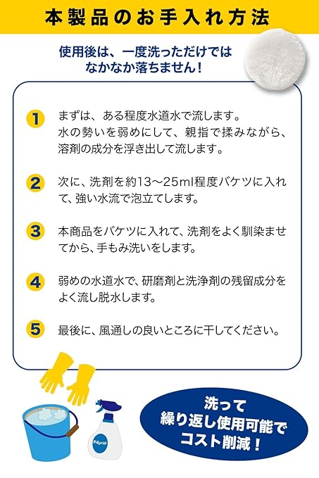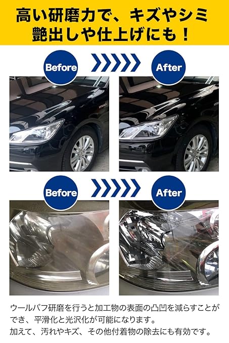 「E-enemo」製のウールバフは、研磨力が強くキズやシミ(イオンデポジット)艶出しや仕上げにもお使いいただけます。