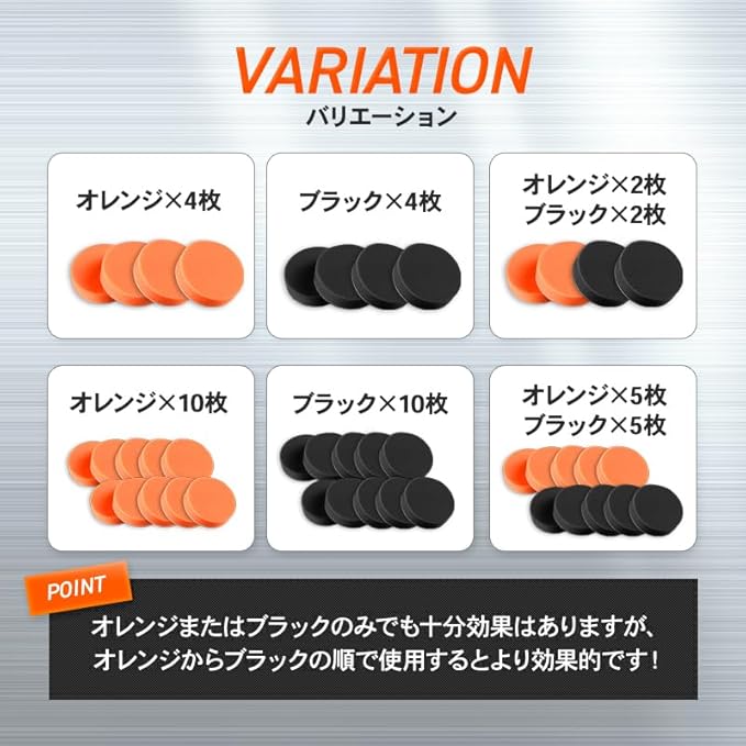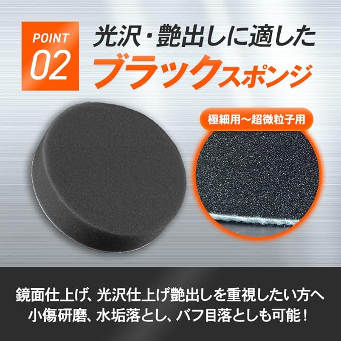 ✅【選べる2種スポンジ】 オレンジスポンジは小傷や水垢研磨に最適、ブラックスポンジは極細~超微粒子研磨で鏡面仕上げを実現。コンパウンド用スポンジとして使えば、車ボディが新車のような光沢に。
