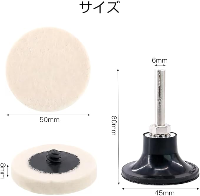 サイズ:研磨バフ外径50mm、厚さ8mm、ディスクブラケット直径45mm、軸の直径6mm、高さ60mm。