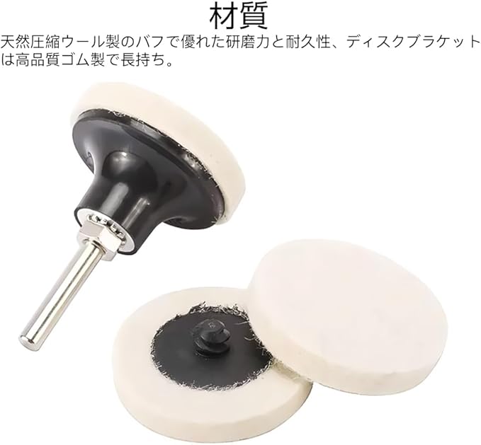 高品質材質:天然圧縮ウール製のバフで優れた研磨力と耐久性、ディスクブラケットは高品質ゴム製で長持ち。