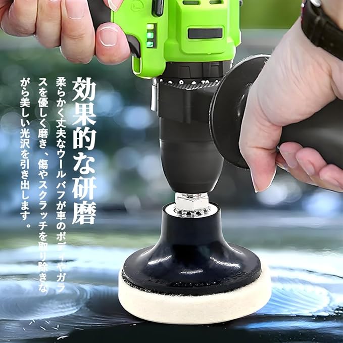 【効果的な研磨】柔らかく丈夫なウールバフが車のボディやガラスを優しく磨き、傷やスクラッチを取り除きながら美しい光沢を引き出します。