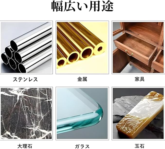 【幅広い用途】金属・ガラス・プラスチック・木材・大理石などに対応。自動車、家具、家電製品の研磨やクリーニングにも活躍。