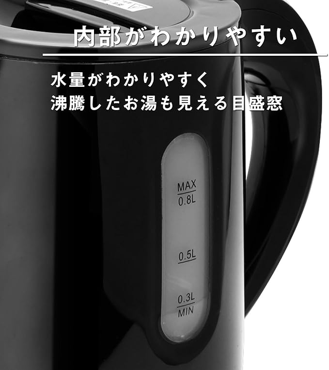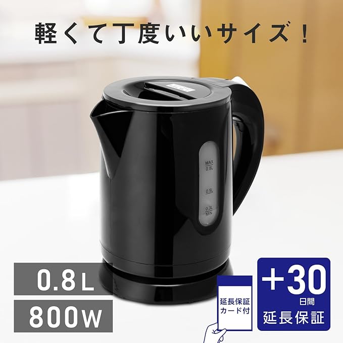 [プラス30日延長保証カード付]イトウ 電気ケトル コンパクトケトル 小型 0.8L 800W 自動電源OFF 空焚き防止 軽量 ブラック 黒