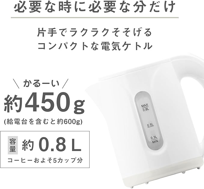 コンパクトで非常に軽い、扱いやすい電気ケトル。