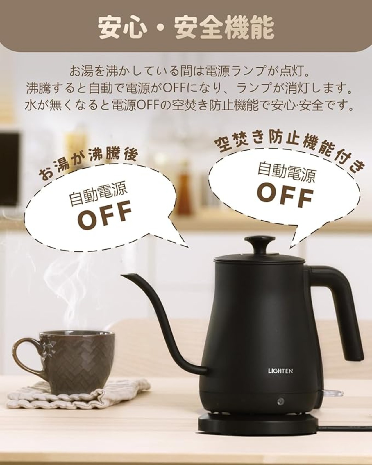 【安心の安全機能・空焚き防止設計電気ケトルの空焚き防止機能が、万が一水を入れ忘れた場合でも自動的に電源をオフ。沸騰後はランプが点滅し、自動停止でさらに安心。安全性を重視した設計で、小さなお子様がいるご家庭にもおすすめです。