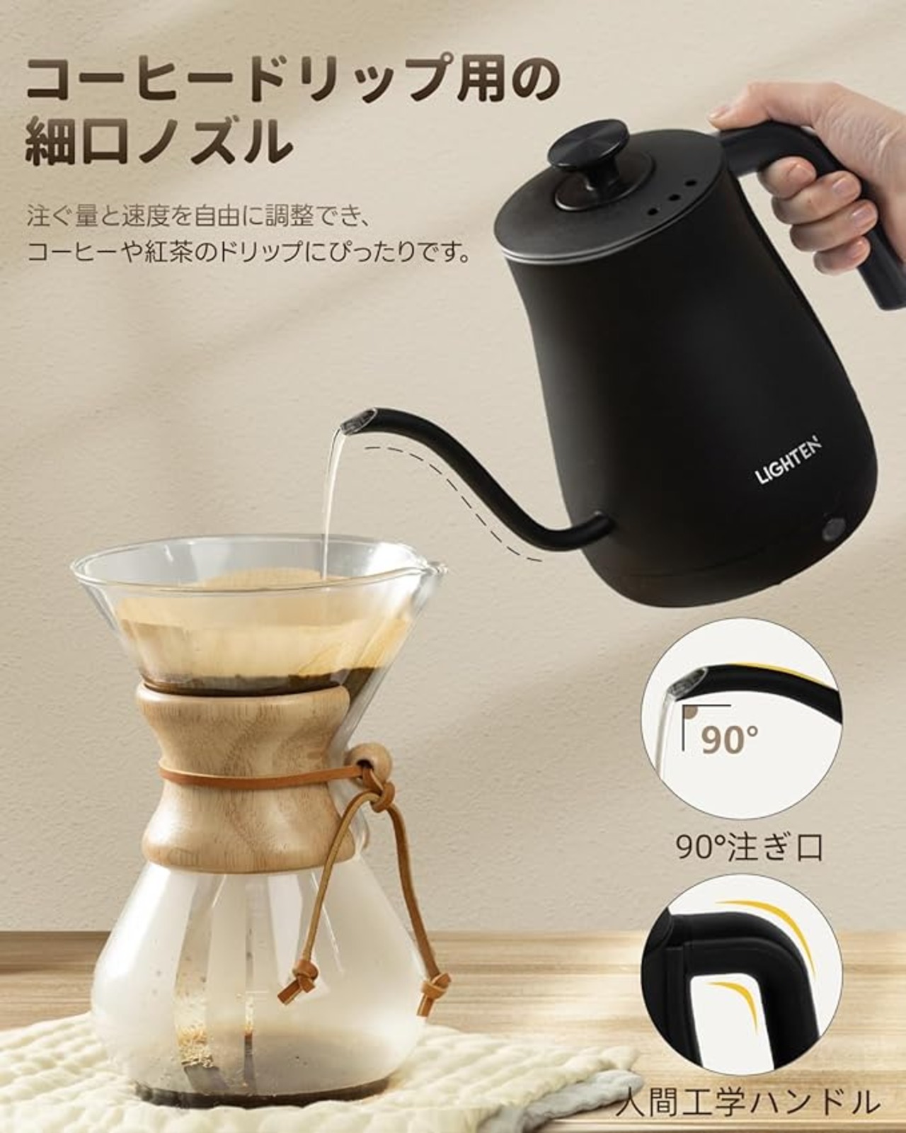 【細口デザインでプロのドリップ体験】ドリップコーヒーに最適な細口注ぎ口は、正確な湯量を注げる設計。湯切れがスムーズで、美しい一滴を楽しめます。手に馴染むハンドルと、マットな質感の洗練された外観が、キッチンに高級感をプラスします。