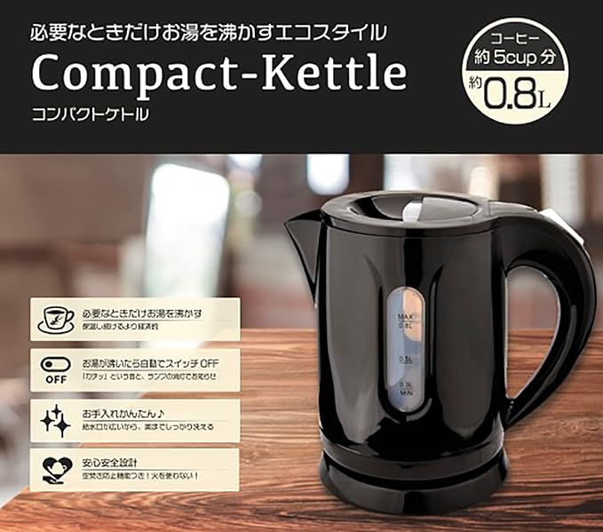 東京Deco 電気ケトル ブラック 800ml コンパクトケトル 急速 800W [必要なときだけお湯を沸かすエコスタイル] 容量 安全 衛生 おしゃれ お洒落 家庭 電気 ポット 湯沸かし器 空焚き防止 湯沸かし ドリップ ポット 細口 コーヒー 1.0L 1L i001