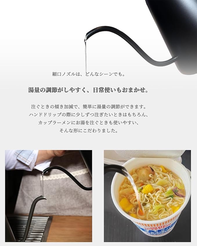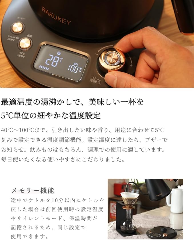 ◆すぐ飲める スピード湯沸かし◆ やかんより短時間でお湯が沸かせて、しかも安全。 電気ポットよりも、光熱費が抑えられます。 ハイパワー設計で、水の状態から設定した温度まであっという間に 沸騰します。さらに、設定温度に到達時すると音でお知らせする アラート機能や、設定した温度で保温する保温機能など、快適な ドリップ体験をサポートする機能も多数搭載。