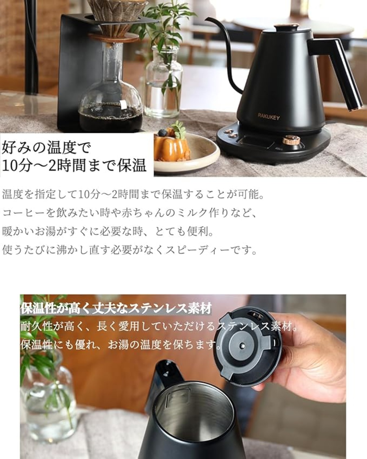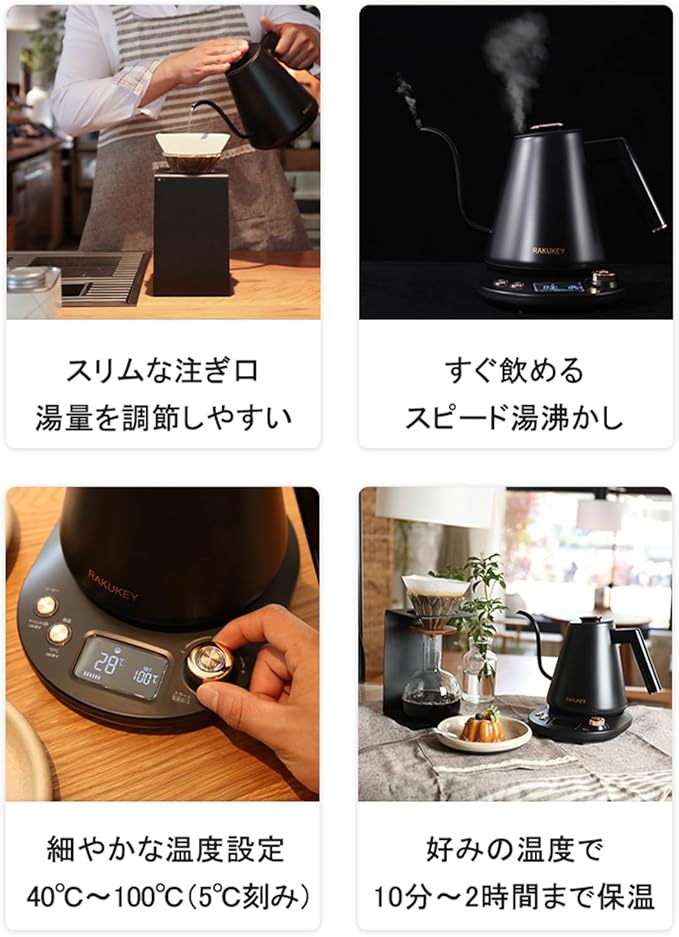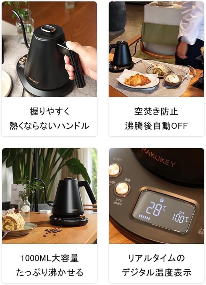 バリスタ推奨★電気ケトル 保温/温度調整 急速沸騰 空焚き防止 自動電源OFF 手入れ簡単 細口【水量と速度を自由にコントロール】コーヒーポット 電気ポット ドリップケトル 湯沸かし おしゃれ ステンレス 1L