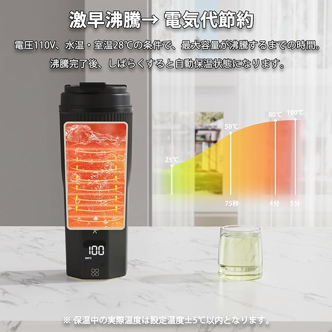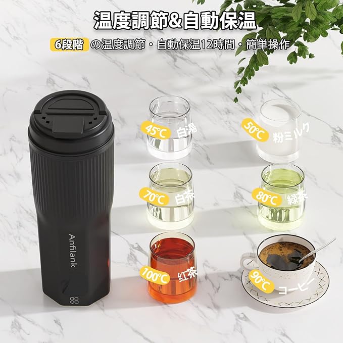 【6段階の温度調節&長時間保温機能】Anfilankポータブル電気ケトルは、高品質温度センサーを搭載し、45℃/55℃/70℃/80℃/90℃/100℃の6段階の細かい温度調節が可能です。さまざまなニーズに合わせて最適な温度を設定できます。また、12時間の長時間保温機能も搭載しており、お湯の温度をすぐに使える状態にキープできます。仕事や勉強に集中しながら温かい飲み物を楽しめます※ 本製品は加熱・保温機能を使用する際、必ずコンセントへの接続が必要です。加熱プログラムの仕組みにより、保温中の実際の温度は目標温度 5℃以内となります。