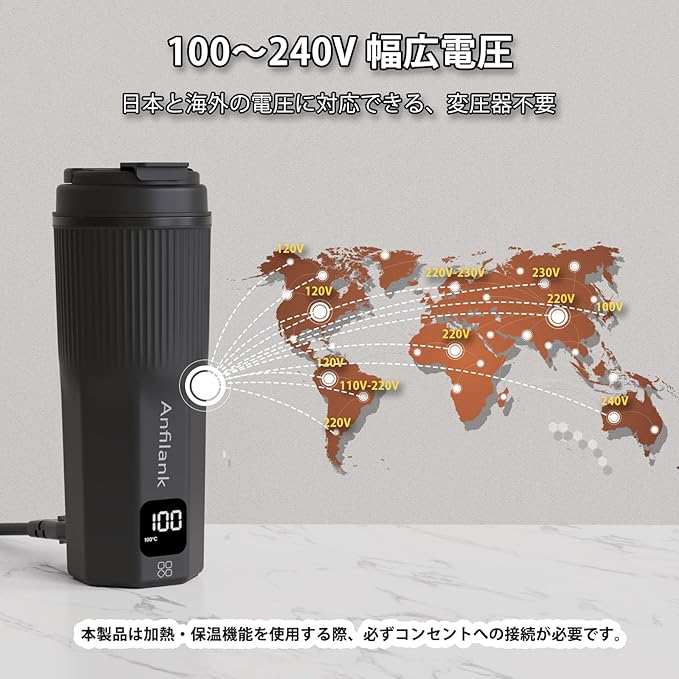 【幅広電圧、日本と海外対応】Anfilank小型電気ケトルは、電圧を切り替えられる変圧器を内蔵しており、AC100〜240Vまで対応しているため、日本と海外の両方で使用可能です。海外旅行中でも電圧を気にせず使用できるため、ホテルでコーヒーやお茶を飲むときも便利です。滞在先のプラグ形状が日本と同じであれば変換プラグも不要で、そのまま使用できます。※本製品はコンセント接続式であり、充電式ではございません。付属のプラグは2ピンタイプとなっており、USB充電ケーブルではございません。