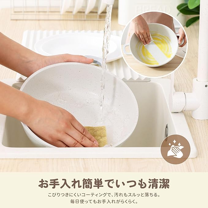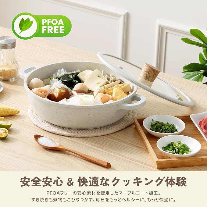 【PFOAフリーで安心調理】マーブルコーティングで焦げつきにくく、食材がきれいに仕上がります。PFOAフリーで人体に有害な物質を含まず、毎日の食卓に安心を。