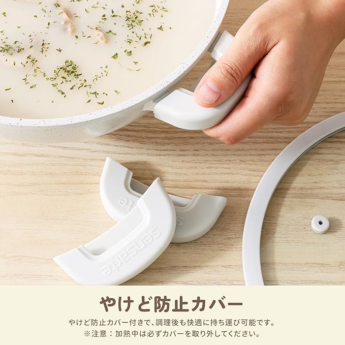 【強化ガラス蓋・やけど防止カバー付き】フラットデザインの蓋は強化ガラスを採用、優れた安全性と耐久性を実現し、調理プロセスコントロールも簡単です。シリコンカバー付きのハンドルはやけどを防止できます。