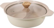 表面加工:内面/セラミック塗膜加工、外面/焼付け塗装、材料の種類:本体/アルミニウム合金、はり底/ステンレス鋼(クロム16%)、底の厚さ/4.5cm、蓋:品名/強化ガラス製器具、強化の種類/全面物理強化、その他の材料:縁リング/ステンレス鋼、つまみ/フェノール樹脂(耐熱温度150度)
