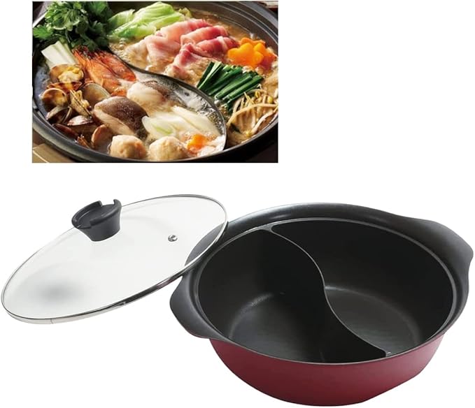 卓上鍋 仕切り鍋 約28cm 3-5人用 両手鍋 2食鍋 ガス火 IH対応 ガラス蓋付 軽量タイプ フッ素加工 異なる味でも一緒に煮込める 鍋料理 火鍋 しゃぶしゃぶ 湯豆腐 おでん うどん ラーメン などに