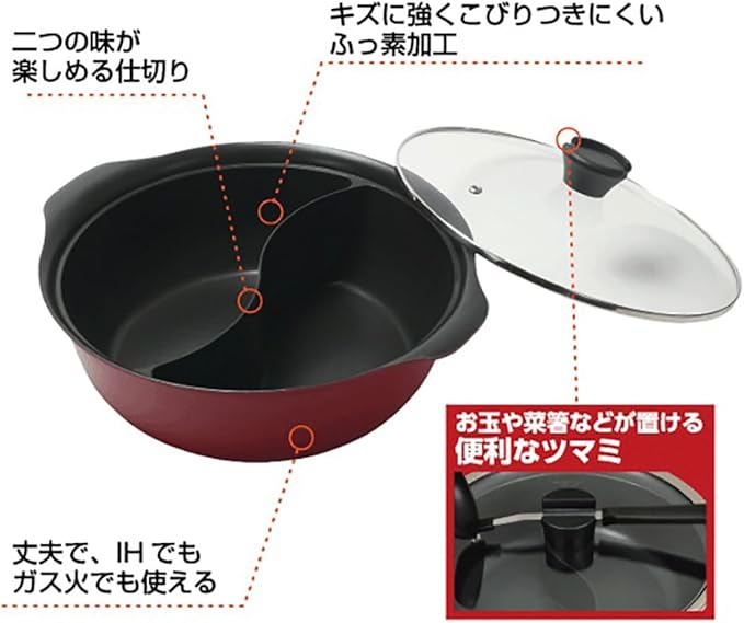 一つのメニューでも薄口、濃口など異なる味付けの料理にもとっても便利。お子様のいるご家庭では辛口・甘口カレーも同時に調理できます。キズに強く、お手入れ簡単でこびりつきにくいフッ素コート仕上げ。和・洋・中など色とりどりの料理を楽しめます! 一つの鍋で済むので、キャンプやバーベキューでも大活躍!保温に便利なガラス蓋付きで、ガス火はもちろんIH電磁調理器などでも使用できます。ガラス蓋のつまみは菜箸やお玉が置ける便利なデザインです!
