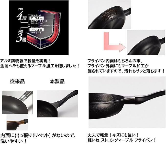 ●内面4層、外面3層、これまでのふっ素加工よりもはるかにこびりつきにくいストロングマーブル