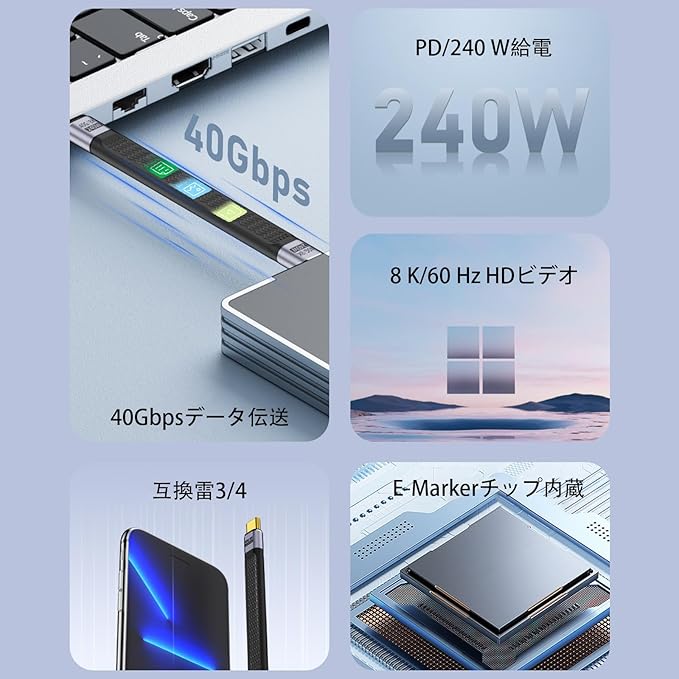 【PD240W急速充電】USB type-c 40gbpsショート100W PD急速充電usb-c 延長ケーブルは、240Wまでの高速充電出力をサポートするEマークチップを内蔵し、Thunderbolt3/4とほとんどのType Cデバイスと完全に互換性があります。