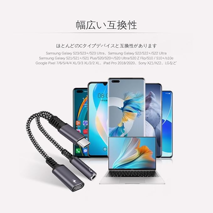 USB Type-Cポートを持つデバイスでも同時に3.5mmイヤホンを使用できる便利なイヤホンジャック変換ケーブル。PD急速充電と音楽鑑賞を同時に楽しめる最適なアイテムです。